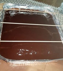 נשפד את התבנית בשלושה שיפודים בחלקה העליון וככה יווצר חיץ בין נייר הכסף לקרם וככה נמנע מ”הריסת” ציפוי העוגה.