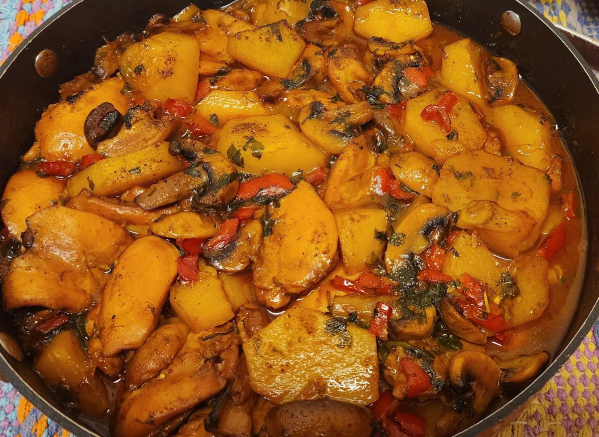נחזיר הבצל פנימה לסיר,נוסיף גמבה אדומה קצוצה,פטריות , תפוחי אדמה חתוכים לפרוסות לא דקות,4 שיני שום כתושות ונערבב היטב.