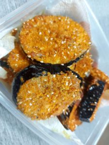 בצלחת שניה את פירורי הלחם עם כל התבלינים והשומשום.