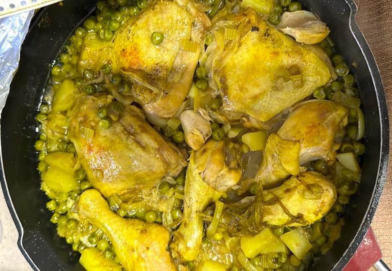את העוף שמים עם העור כלפי מטה ומטגנים כ- 5 דקות.