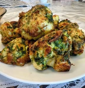 טובלים את פרחי הכרובית ברוטב היטב ומטגנים בשמן חם.