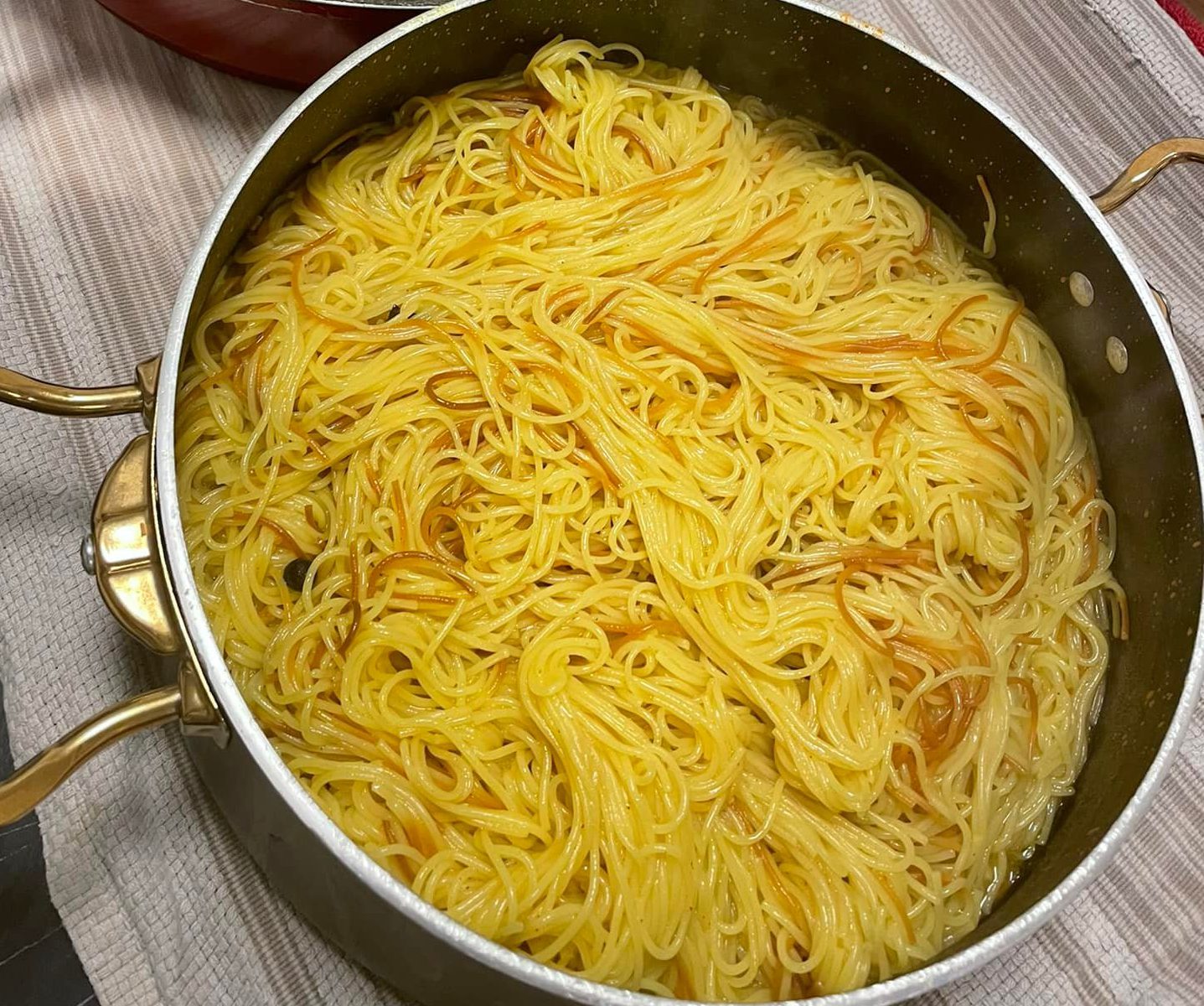 ברגע שהנוזלים התאדו והאיטריות יבשות ומוכנות, מוסיפים זילוף קטן של שמן טרי לסיר.