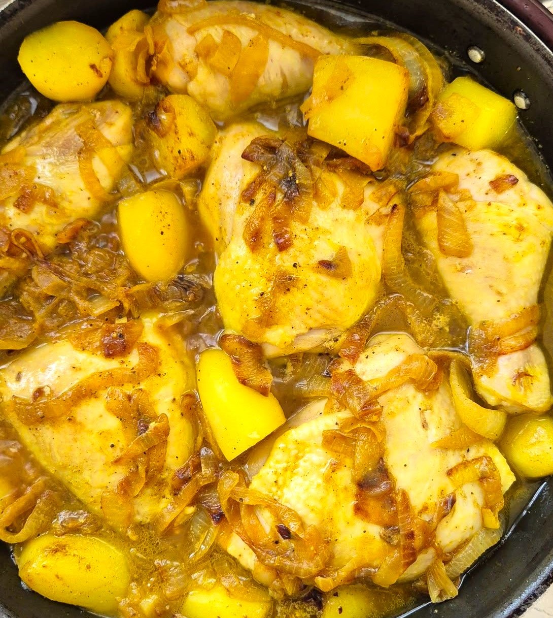 סיר חגיגי לשבת המבוסס על טיגון עמוק של טעמים, צבע זהוב משגע ומרקם נימוח. זהו תבשיל “יבש” יחסית שבו העוף ותפוחי האדמה מתבשלים במיצים של עצמם ושל הבצל.