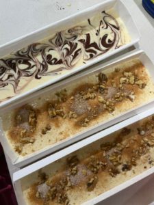 עוגת שיש: מוציאים חצי כוס מהבלילה המוכנה, מערבבים עם כף  של קקאו  יוצרים דוגמת שיש מעל הבלילה הלבנה ואופים.