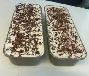 הכנת הקרם והציפוי: בקערת המיקסר מקציפים את השמנת, הפודינג וכף הקפה הנמס עד לקבלת קרם יציב מאוד.