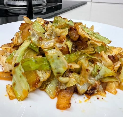 מוסיפים את רצועות הכרוב לסיר ומערבבים היטב כדי שכל הכרוב ייעטף ברוטב הפיקנטי.
