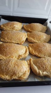 מברישים כל סמבוסק בחלמון ביצה ומפזרים שומשום בנדיבות.